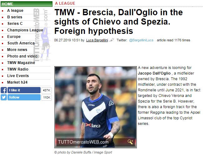 Δημοσιεύματα από την Ιταλία, κάνουν λόγο για ενδιαφέρον κυπριακής ομάδας για τον Ιταλό μέσο, Γιάκοπο Νταλόλιο. Όπως αναφέρει η ιστοσελίδα tuttomercato ο 27χρονος μέσος που ανήκει στην Μπρέσια και κατέγραψε τη λήξασα σεζόν 17 συμμετοχές θα αποχωρήσει από την ομάδα στην οποία βρίσκεται εδώ και μία τετραετία.