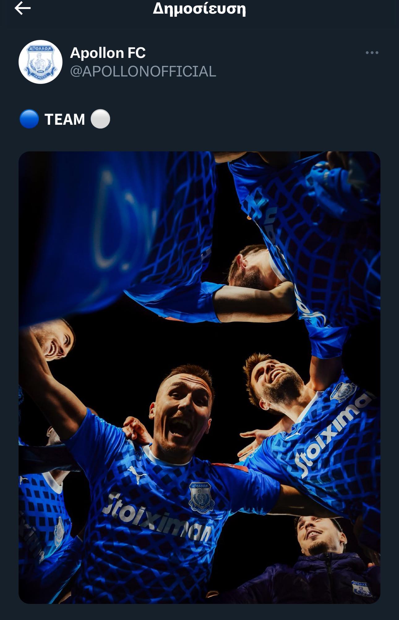 O Aπόλλωνας ανάρτησε πανηγυρικό στιγμιότυπο από την πρόκριση στο κύπελλο κόντρα στην ΑΕΚ, συνοδευόμενη με τη λεζάντα «ΟΜΑΔΑ».