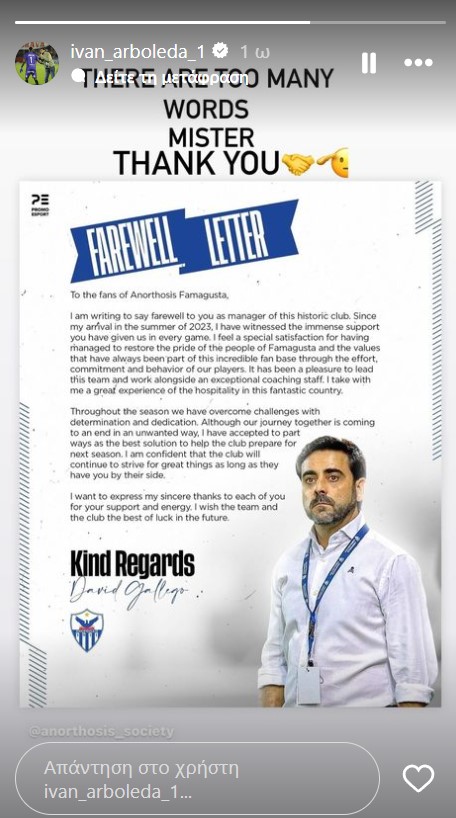 Το δικό του «αντίο» αλλά και «ευχαριστώ» στον Γκαγιέγο έστειλε μέσω ανάρτησής του ο Ιβάν Αρμπολέδα.
