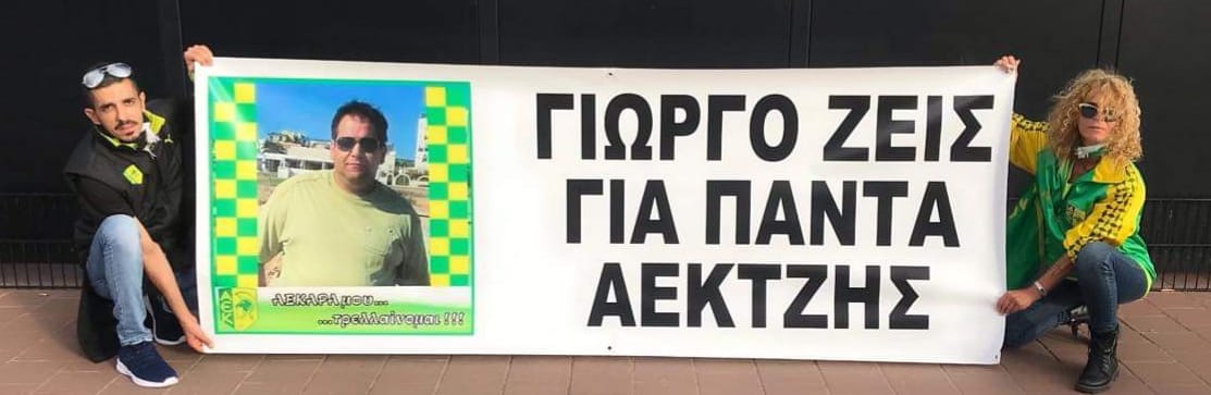 Πριν από λίγες μέρες, έφυγε από τη ζωή ένας πιστός φίλος των κιτρινοπρασίνων της Λάρνακας, ο Γιώργος Κωνσταντίνου. Οι φίλοι των Λαρνακέων δεν τον ξέχασαν και πήραν μαζί τους στο Βέλγιο ένα πανό για να τιμήσουν τη μνήμη του δικού τους ανθρώπου.