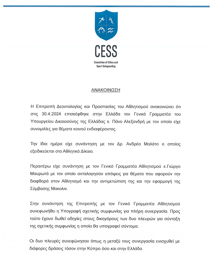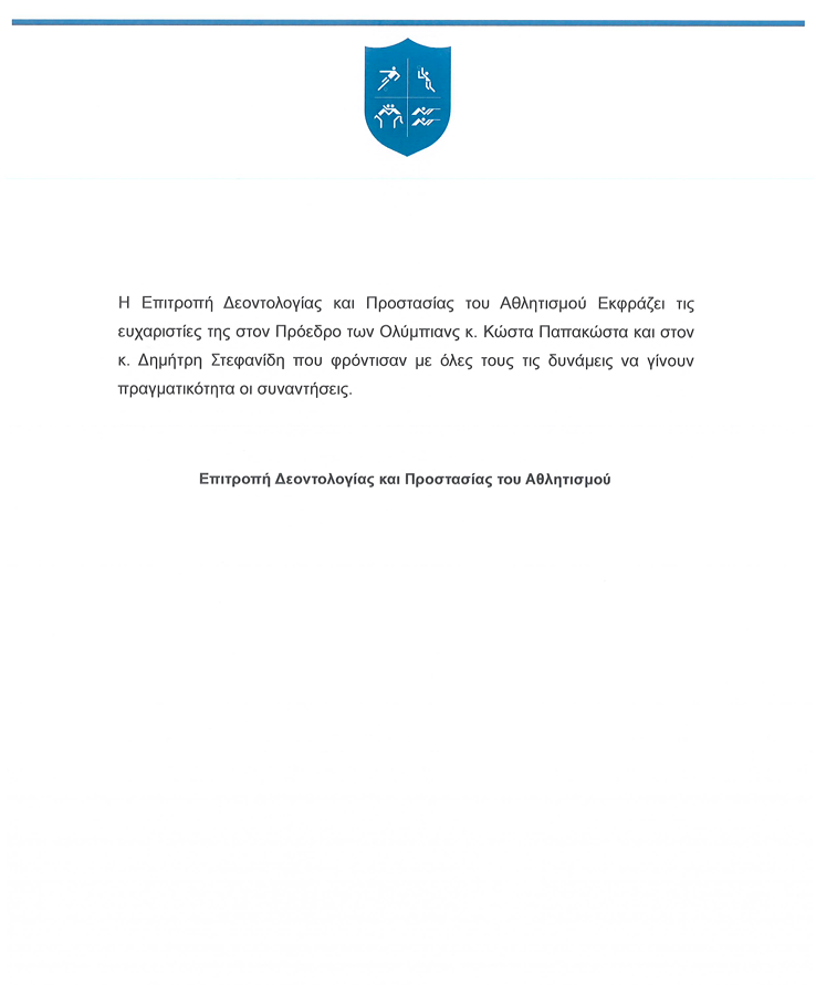 Με ανακοίνωσή της η Επιτροπή Δεοντολογίας και Προστασίας του Αθλητισμού ενημερώνει για το πρόσφατο ταξίδι της στην Ελλάδα και τα αποτελέσματά του.