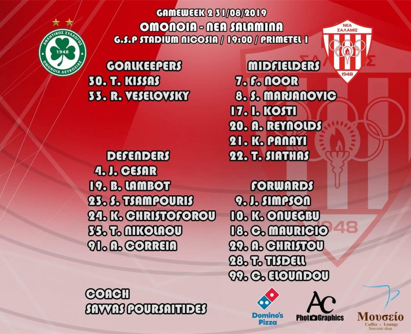 Η Νέα Σαλαμίνα αντιμετωπίζει αύριο (31/8) την Ομόνοια στο ΓΣΠ για την 2η αγωνιστική του πρωταθλήματος και ανακοίνωσε την αποστολή ενόψει του συγκεκριμένου αγώνα.