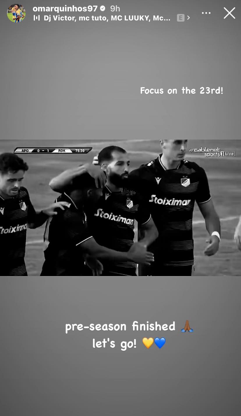 Με ανάρτηση βίντεο από την εύστοχη εκτέλεση πέναλτι στο χθεσινό φιλικό του ΑΠΟΕΛ με την Ραντνίσκι, ο Μαρκίνιος έστειλε το δικό του μήνυμα ενόψει της συνέχειας, αναφέροντας ότι πλέον η προσοχή μεταφέρεται στο πρώτο ευρωπαϊκό παιχνίδι, στις 23 Ιουλίου.