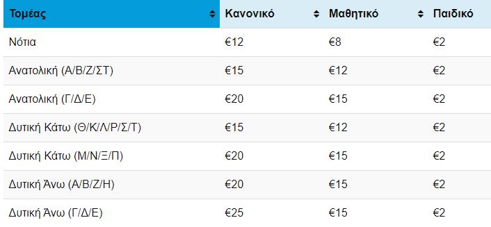 Οι τιμές των εισιτηρίων ορίστηκαν ως εξής:
