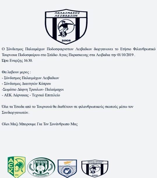 Την Παρασκευή 01 Οκτωβρίου θα διεξαχθεί το ετήσιο Φιλανθρωπικό τουρνουά ποδοσφαίρου που διοργανώνουν οι παλαίμαχοι ποδοσφαιριστών των Λειβαδιών. Θα δώσουν το παρών τους ο σύνδεσμος διαιτητών Κύπρου, οι παλαίμαχοι του Σωματείου Δάφνη-Τρούλλοι και το τεχνικό επιτελείο της ΑΕΚ Λάρνακας.