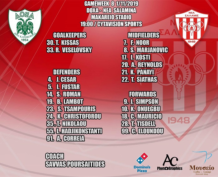 Την αποστολή για το αυριανό παιχνίδι με τη Δόξα ανακοίνωσε η Νέα Σαλαμίνα.