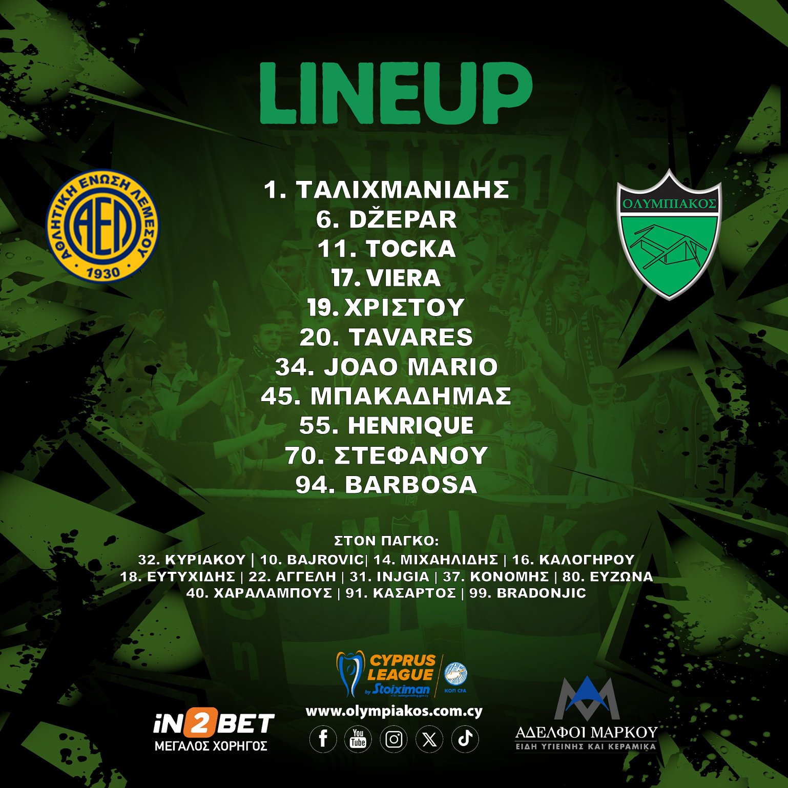 ΟΛΥΜΠΙΑΚΟΣ: Ταλιχμανίδης, Τζέπαρ, Τότσκα, Βιέρα, Χρίστου, Ταβάρες, Ζοάο Μάριο, Μπακαδήμας, Ενρίκε, Στεφάνου, Μπαρμπόσα.