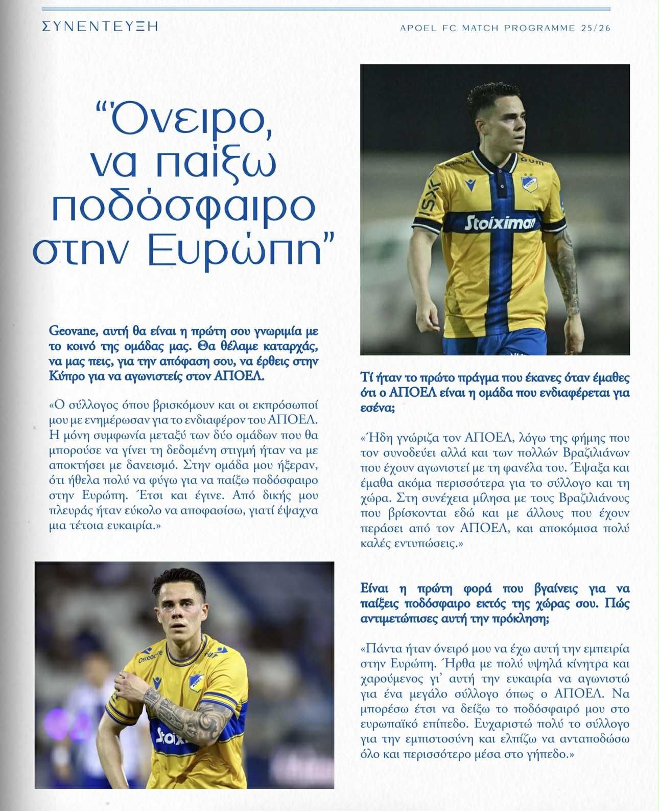 Εν όψει της εντός έδρας αναμέτρησης με τον Εθνικό Άχνας για την 9η αγωνιστική στη Cyprus League by Stoiximan ο ΑΠΟΕΛ κυκλοφόρησε το match-programm, το οποίο φιλοξενεί συνέντευξη του Ζιοβάνε Μέουρερ.