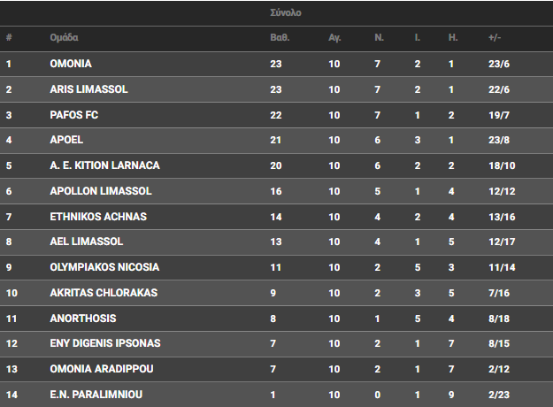 Στο ντέρμπι «αιωνίων» η Ομόνοια κρατούσε τη νίκη όμως στην τελευταία φάση ο ΑΠΟΕΛ ισοφάρισε σε 2-2. Οι «πράσινοι» έφτασαν τους 23 βαθμούς, είναι στην πρώτη θέση, όμως με συγκάτοικο τον Άρη. Από την άλλη οι «γαλαζοκίτρινοι», με τον βαθμό που πήραν έφτασαν τους 21 και είναι στην 4η θέση.