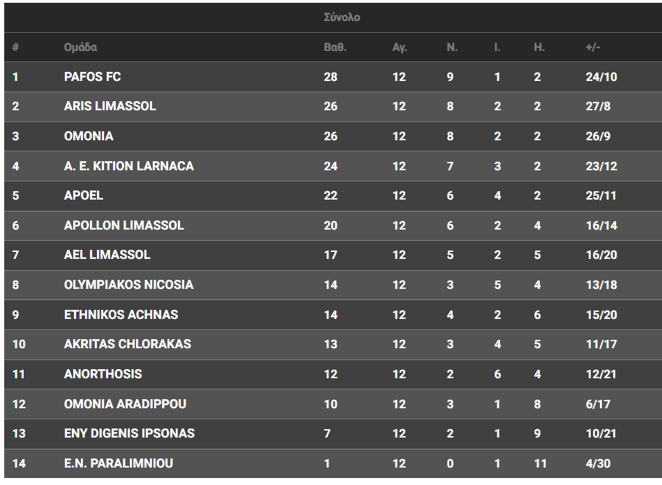 Με τα σημερινά παιχνίδια δεν θα είχαμε καμία διαφοροποίηση στην κορυφή, η Πάφος συνεχίζει να οδηγεί την κούρσα με 28 βαθμούς, βρισκόμενη στο +2 από Άρη και Ομόνοια, ενώ η ΑΕΚ μετά την ισοπαλία με τον Ακρίτα Χλώρακας, έχει μείνει στην 4η θέση με 24 βαθμούς, με την ομάδα του Μάριου Νικολάου να τους βάζει δύσκολα.