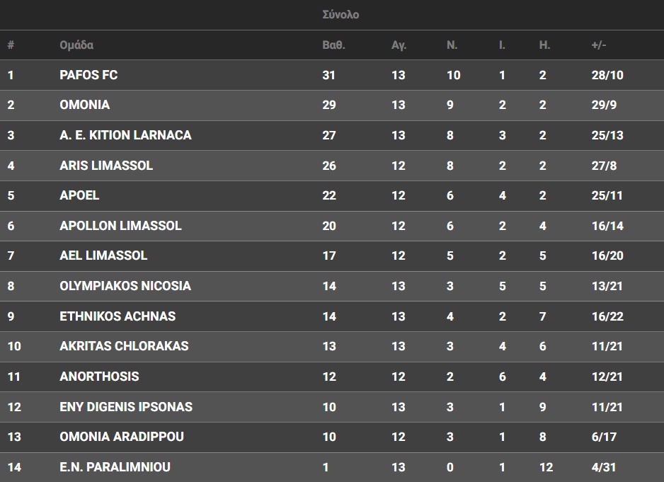 Η Ομόνοια με το νέο της τρίποντο έφτασε στους 29 βαθμούς και το -2, πλησιάζοντας επικίνδυνα την πρωτοπόρο Πάφο, ενώ η ΑΕΚ με την επιστροφή της στις επιτυχίες, άφησε πίσω της τον Άρη με τη διαφορά των δύο ομάδων να είναι στο +1. Η αγωνιστική θα ολοκληρωθεί αύριο με αναμετρήσεις σε «ΠΑΠ», ΓΣΠ και στάδιο «Αλφαμέγα», με το ΑΠΟΕΛ-Άρης να συγκεντρώνει βαθμολογικά κυρίως το μεγαλύτερο ενδιαφέρον.