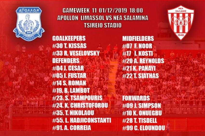 Η Νέα Σαλαμίνα σε επίσημη της ενημέρωση ανακοίνωσε την εικοσάδα για το παιχνίδι απέναντι στον Απόλλωνα.