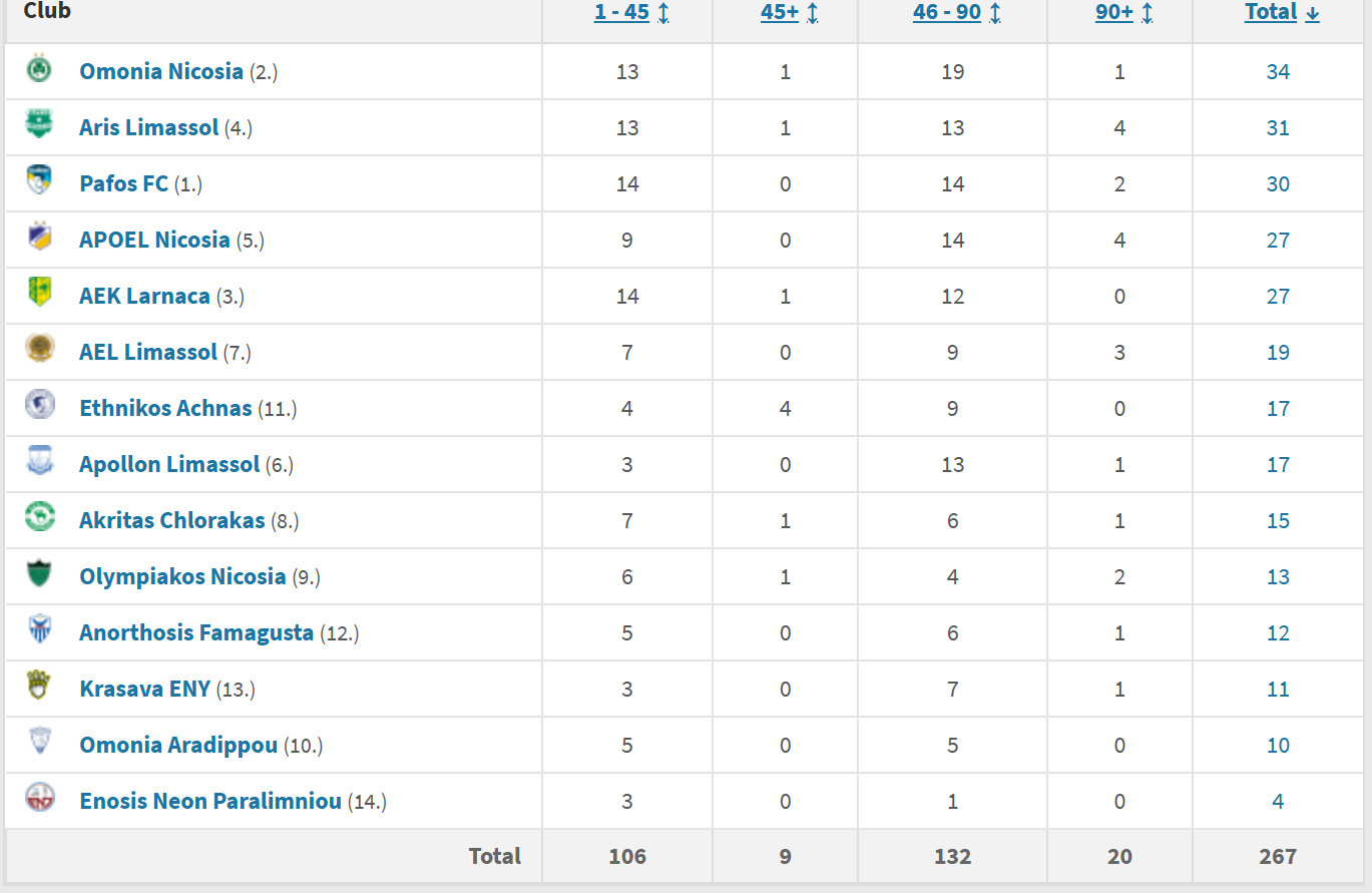 Στο δεύτερο μέρος, ωστόσο, το σκηνικό αλλάζει. Η απόλυτη κυριαρχία στην επανάληψη ανήκει στην Ομόνοια, η οποία βρήκε δίχτυα 20 φορές, δείχνοντας τεράστια αποθέματα δυνάμεων στο τέλος των αγώνων. Ακολουθεί ο ΑΠΟΕΛ με 18 τέρματα, ο Άρης με 17 και η Πάφος με 16.