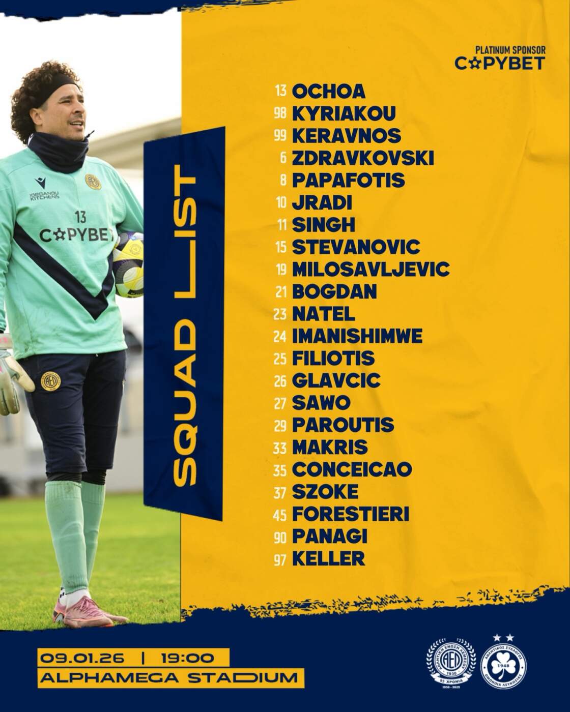 Εκτός αποστολής: Οι Φραντζής (υπέστη βαρύ διάστρεμμα στην προπόνηση), Φεριέρ, Ουεντραόγκο, Χριστοδούλου, Γουίλερ, Νεοφύτου.