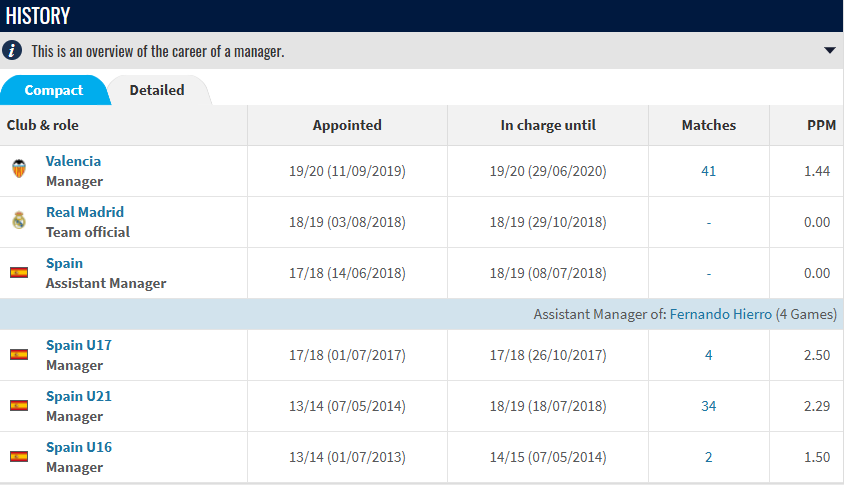 Πρόκειται για ένα πολύ «δυνατό» όνομα, με τελευταίο του σταθμό τη Βαλένθια, όπου παρέμεινε μέχρι τον Ιούνιο του 2020, ενώ έχει διατελέσει με επιτυχία και ομοσπονδιακός προπονητής στις μικρές εθνικές ομάδες της Ισπανίας.
