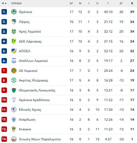 Στο ΑΛΦΑΜΕΓΑ της Λεμεσού, ο Άρης κέρδισε με 1-0 την ΑΕΚ και την έπιασε στους 34 βαθμούς. Οι δύο ομάδες βρίσκονται μαζί με την Πάφο, η οποία έχει δύο παιχνίδια λιγότερα. Έχασε έδαφος από τη κορυφή η ομάδα της Λάρνακας, από την άλλη όμως, ο Άρης κράτησε επαφή με τις πρώτες θέσεις.