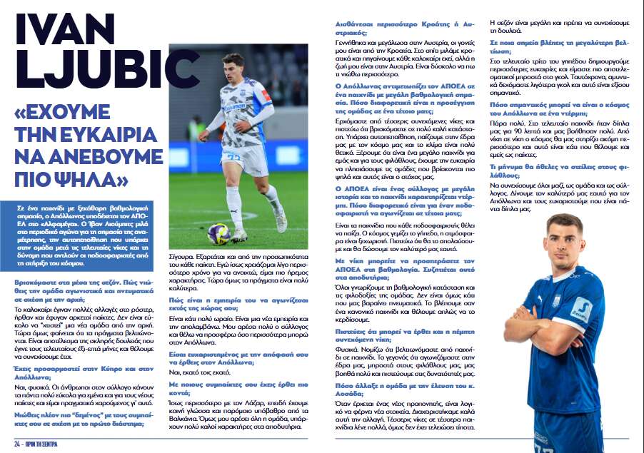 Ο Απόλλωνας εξέδωσε το Match Program του σημερινού (18/01) αγώνα με τον ΑΠΟΕΛ για την 18η αγωνιστική της Cyprus League by Stoiximan. Οι «κυανόλευκοι» σε αυτό το τεύχος φιλοξενούν συνέντευξη του Ιβάν Λιούμπιτς.