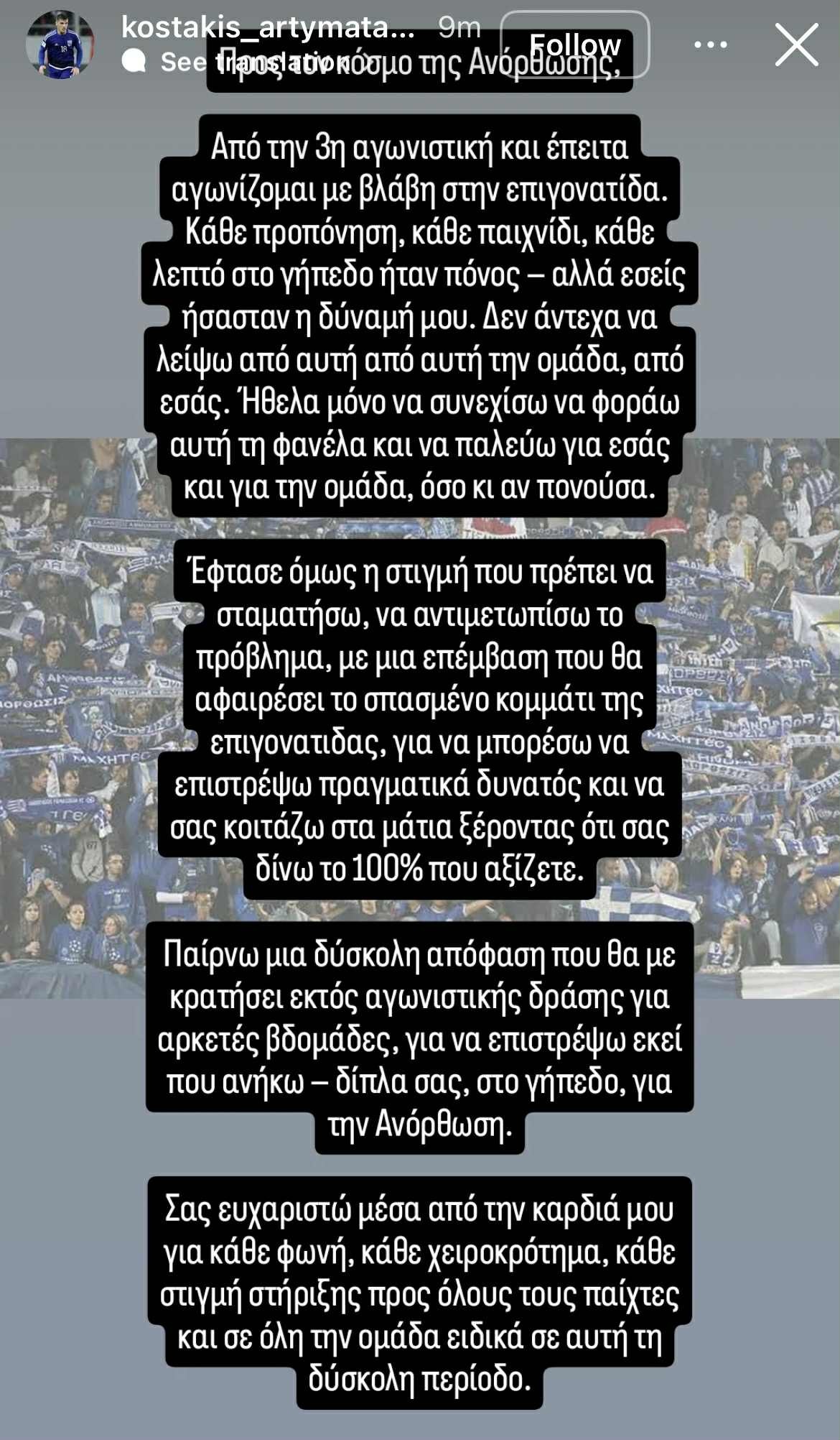 «Από την 3η αγωνιστική και έπειτα αγωνίζομαι με βλάβη στην επιγονατίδα. Κάθε προπόνηση, κάθε παιχνίδι, κάθε λεπτό στο γήπεδο ήταν πόνο. Αλλά εσείς ήσασταν η δύναμη μου. Δεν άντεχα να λείψω από αυτήν την ομάδα. Ήθελα να συνεχίσω... Έφτασε η στιγμή που πρέπει να σταματήσω, να αντιμετωπίσω το πρόβλημα με επέμβαση... Παίρνω μία δύσκολη απόφαση, θα λείψω για αρκετές εβδομάδες...»
