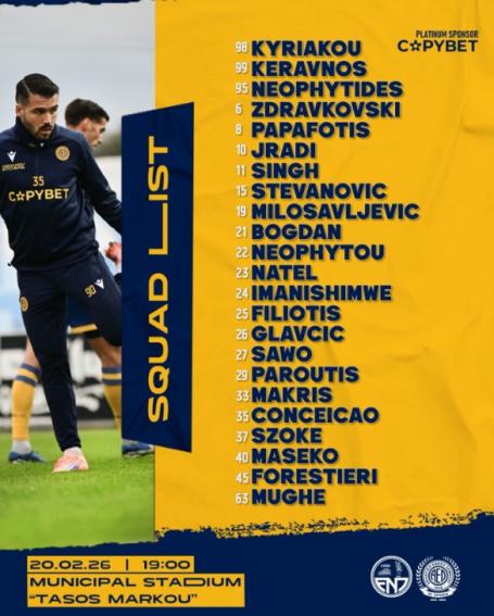 Την αποστολή για την εκτός έδρας δοκιμασία με την Ένωση Νέων Παραλιμνίου στο «Τάσος Μάρκου» για την 23η αγωνιστική του πρωταθλήματος, ανακοίνωσε ο προπονητής της ΑΕΛ