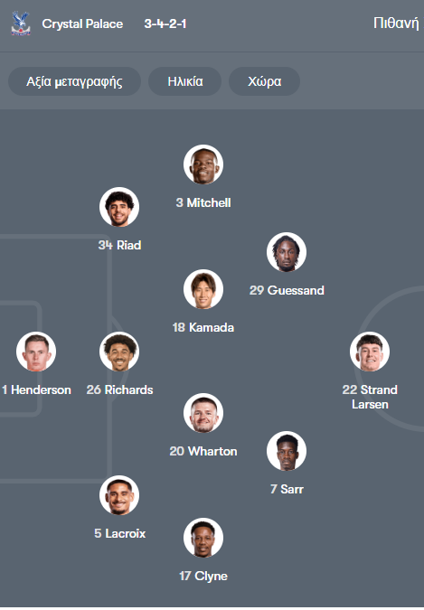Henderson, Richards, Lacroix, Riad; Clyne, Wharton, Kamada, Mitchell; Sarr, Guessand; Strand Larsen.