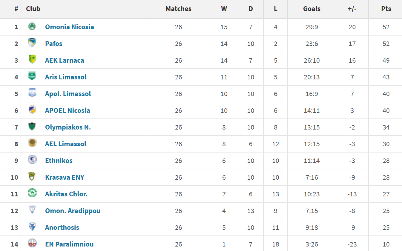 Στην 7η θέση βρίσκεται ο Ολυμπιακός με 34 βαθμούς έναντι 28. Πτώση εννέα βαθμών και πέντε θέσεων έχει η Ομόνοια Αραδίππου που είναι στους 25 και τη 12η θέση και στην εν λόγω βαθμολογία είναι στη ζώνη υποβιβασμού μαζί με Ανόρθωση και ΕΝΠ. Με την ομάδα του Παραλιμνίου να έχει μια νίκη και επτά ισοπαλίες στη σχετική κατάταξη, αλλά και πάλι στην τελευταία θέση.