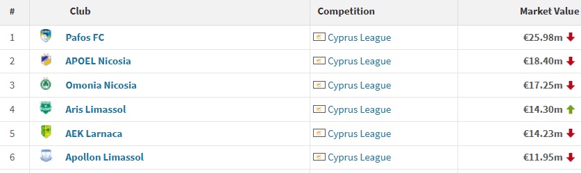 Τώρα όσον αφορά το πρωτάθλημα της Cypruse League by Stoiximan, σε αυτή την ανανεωμένη λίστα του transfermarkt, η Πάφος μπορεί να παρουσιάζει πτώση, όμως εξακολουθεί να έχει το πιο ακριβό ρόστερ με σχεδόν 26 εκατομμύρια.