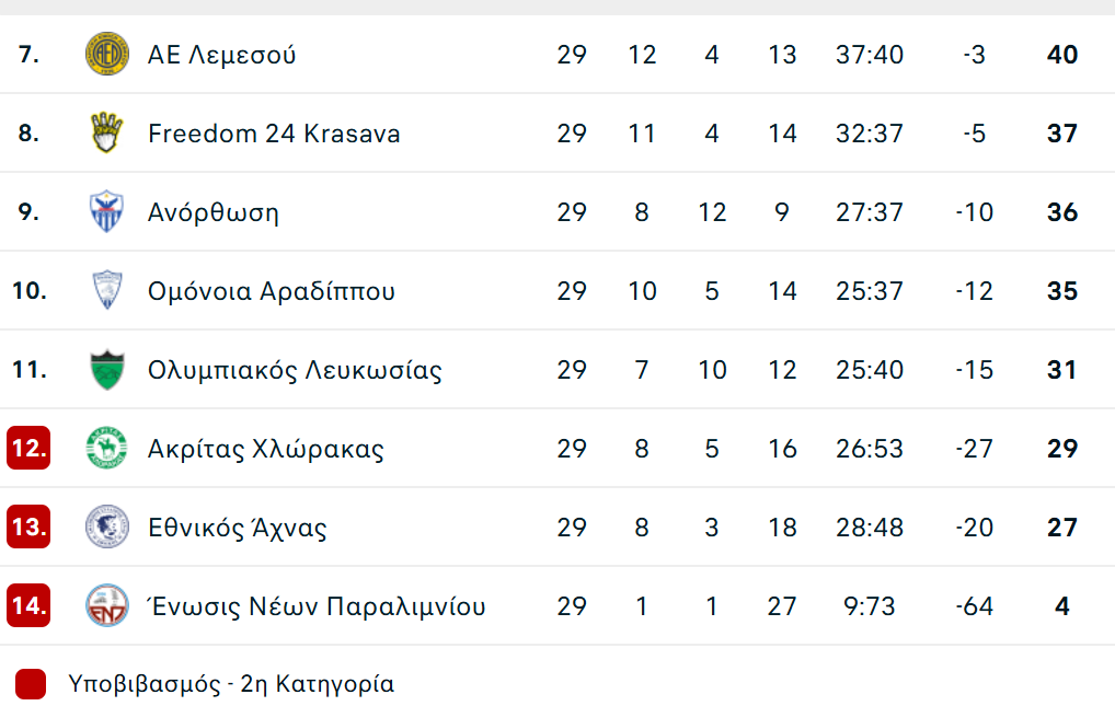 Η αυλαία της ημέρας έπεσε στο «Αμμόχωστος», με τη Freedom24 Krasava ΕΝΥ να παίρνει μια μεγάλη νίκη με 3-1 επί του Εθνικού Άχνας. Οι γηπεδούχοι έκαναν αποφασιστικό βήμα για τη σωτηρία τους, αφού πλέον βρίσκονται στο +8 από τη 12η θέση και τον Ακρίτα. Με μόλις 12 διαθέσιμους βαθμούς να απομένουν, η Krasava βρίσκεται «αγκαλιά» με την παραμονή της στη μεγάλη κατηγορία.