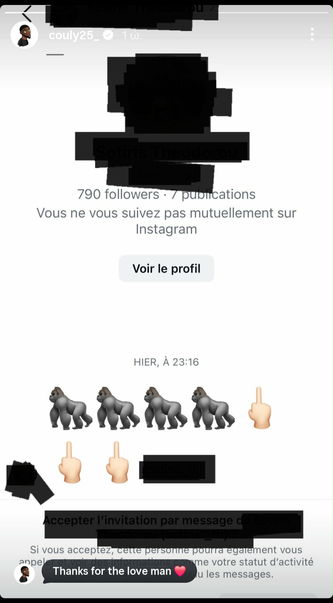 Ο κεντρικός αμυντικός της Ομόνοιας δέχθηκε ρατσιστική επίθεση μέσω του προσωπικού του λογαριασμού στο Instagram. Ο ίδιος επέλεξε να μην σιωπήσει, αναρτώντας σε story το περιεχόμενο της επίθεσης και δίνοντας απάντηση σε αυτόν που κινήθηκε ρατσιστικά εναντίον του.