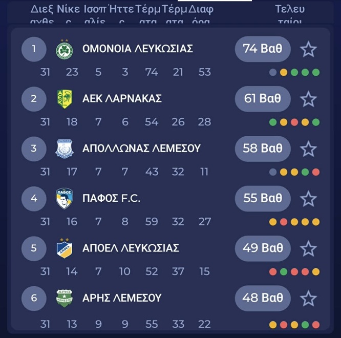 Η Πάφος που κατάφερε στις καθυστερήσεις να ισοφαρίσει σε 3-3 τον ΑΠΟΕΛ πήγε στους 55 βαθμούς και πλησίασε τον Απόλλωνα στους τρείς βαθμούς. Ο ΑΠΟΕΛ με τη σειρά του έμεινε στην 5η θέση με 49 βαθμούς και στόχος του πλέον, είναι η ανατροπή και η πρόκριση στο τελικό του Κυπέλλου καθώς μέσω πρωταθλήματος δεν μπορεί να ελπίζει για έξοδο στην Ευρώπη.