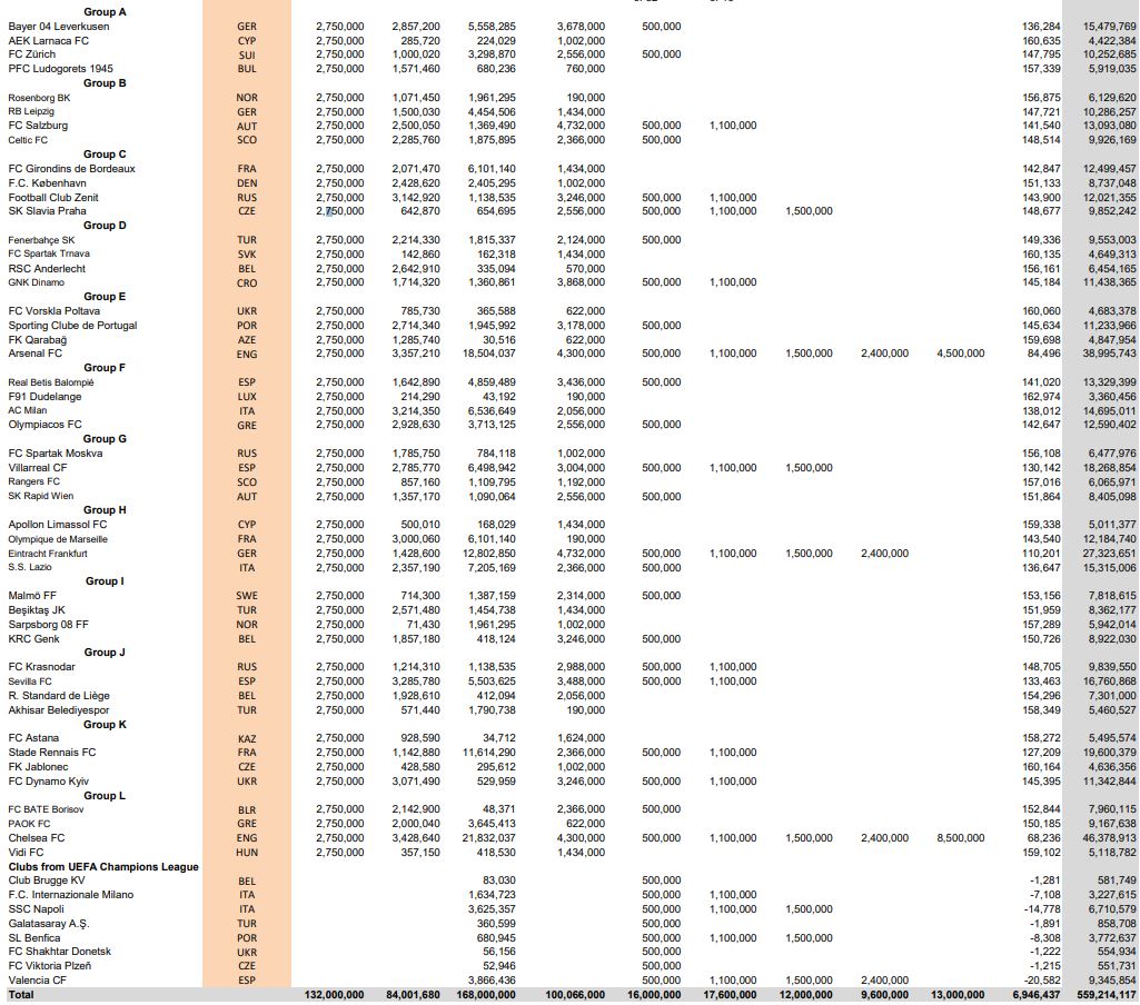 Η ΟΥΕΦΑ ανακοίνωσε τα έσοδα για τις ομάδες που συμμετείχαν στους ομίλους του Γιουρόπα Λιγκ της σεζόν 2018/19, στους οποίους βρίσκονταν ΑΕΚ και Απόλλωνας.