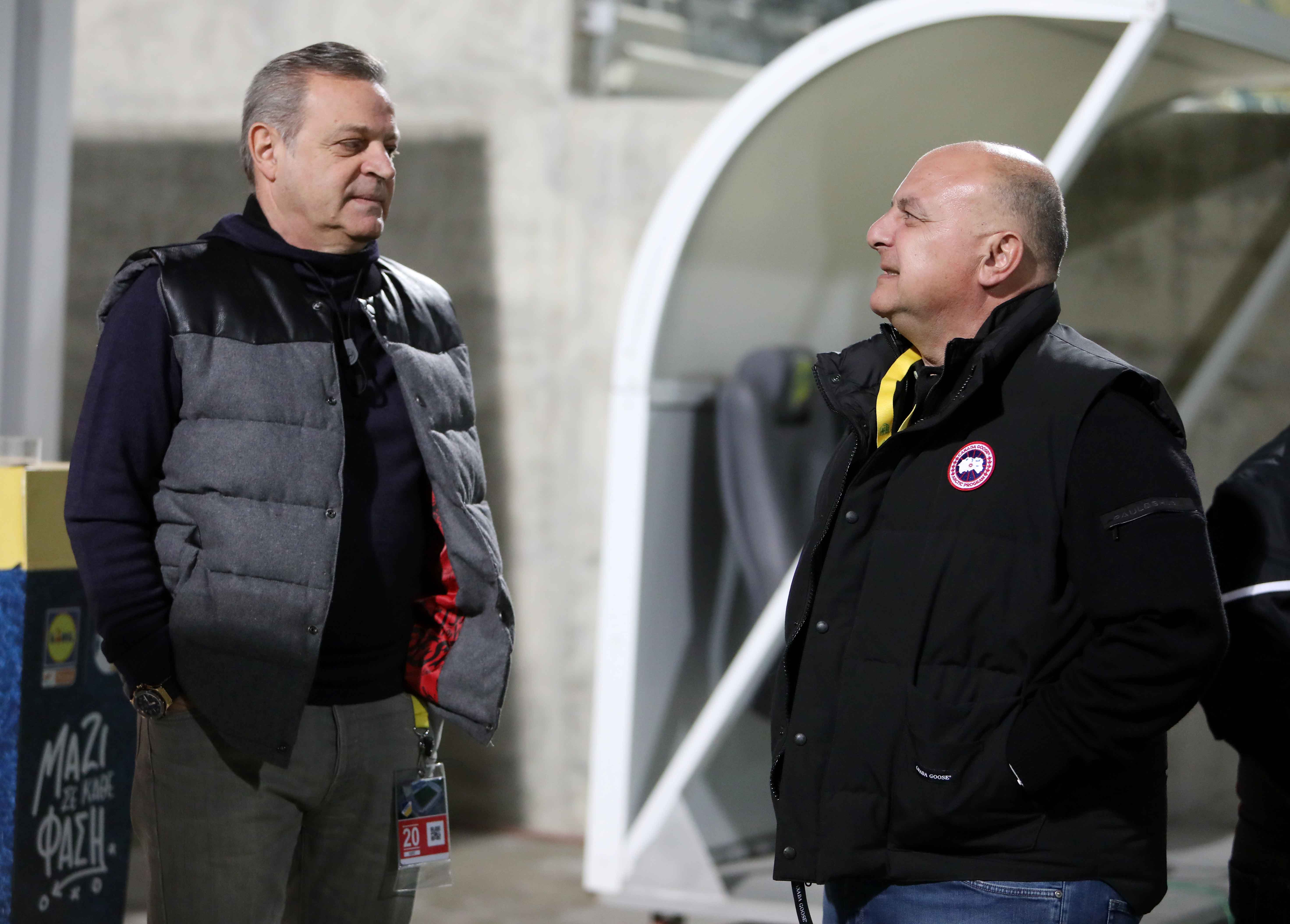 Λίγα λεπτά πριν τη σέντρα στην κρίσιμη αναμέτρηση ανάμεσα σε ΑΕΚ και ΑΠΟΕΛ οι διοικητικοί ηγέτες των δύο συλλόγων είχαν συζήτηση σε πολύ καλό κλίμα. Άντρος Καραπατάκης και Πρόδρομος Πετρίδης σ' ένα «πηγαδάκι» κορυφής.