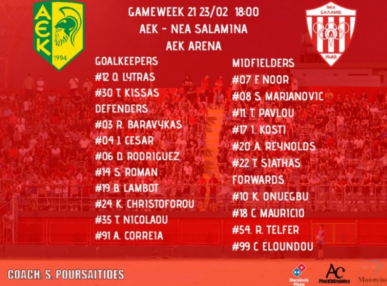 Η Νέα Σαλαμίνα γνωστοποίησε την αποστολή της ομάδας ενόψει του αγώνα με την ΑΕΚ στην ''Αρένα'' για την 21η αγωνιστική.