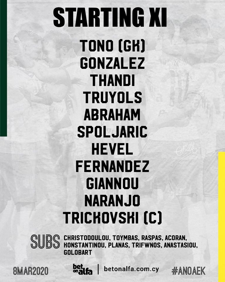Στον πάγκο: Χριστοδούλου, Τούμπας, Ακοράν, Αναστασίου, Πλάνας, Γκολομπάρτ, Ράσπας, Τρύφωνος, Κωνσταντίνου