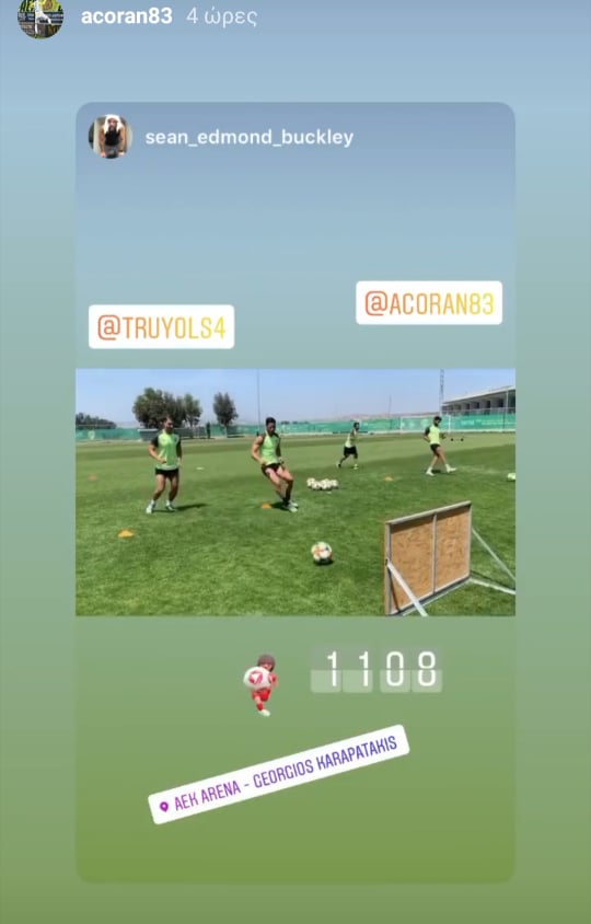 Ο γυμναστής της ΑΕΚ με την πιο κάτω ανάρτηση μας δείχνει τους Ακοράν και Τρουγιόλς που κάνουν την προπόνηση τους στο βοηθητικό γήπεδο δίπλα από την ''Αρένα''.