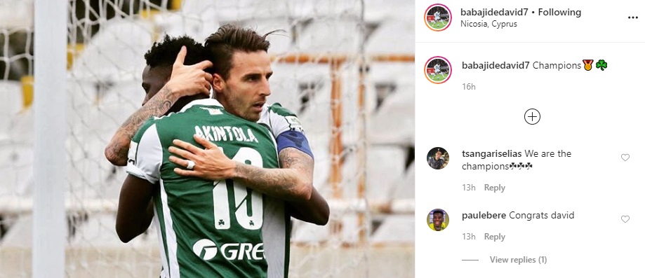 Ανάρτηση στο λογαριασμό του στο instagram έκανε και ο Νταβίντ Ακιντόλα της Ομόνοιας. Μια φωτογραφία με τον αρχηγό της ομάδας Ματ Ντάρμπισάιαρ σε πανηγυρικό στιγμιότυπο και με τη λεζάντα "πρωταθλητές".