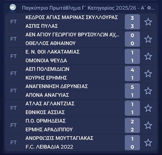 Τα αποτελέσματα στη Γ' Κατηγορία! Γ' ΚΑΤΗΓΟΡΙΑ 15.11.202516:56 Το Σάββατο (15/11) πραγματοποιήθηκαν όλοι οι αγώνες για την 8η αγωνιστική του πρωταθλήματος Γ' κατηγορίας. Αναλυτικά: c59b43b3-54d7-4c47-90f0-669b421936c3.jpg