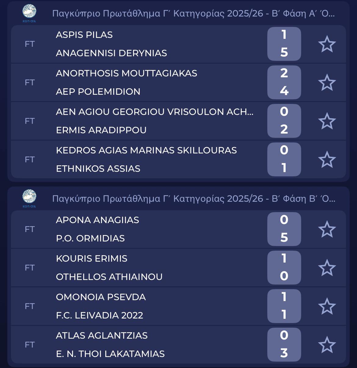 Ολοκληρώθηκαν οι αναμετρήσεις στο πρωτάθλημα της 8η αγωνιστικής σε α' και β' όμιλο για τη Γ' κατηγορία. Δείτε τα σημερινά αποτελέσματα. Στην κορυφή του α' ομίλου η Αναγέννηση Δερύνειας, στη 2η θέση η ΑΕΠ. Στην κορυφή του β' ομίλου η Π.Ο Ορμήδειας, στη 2η θέση ο Οθέλλος.